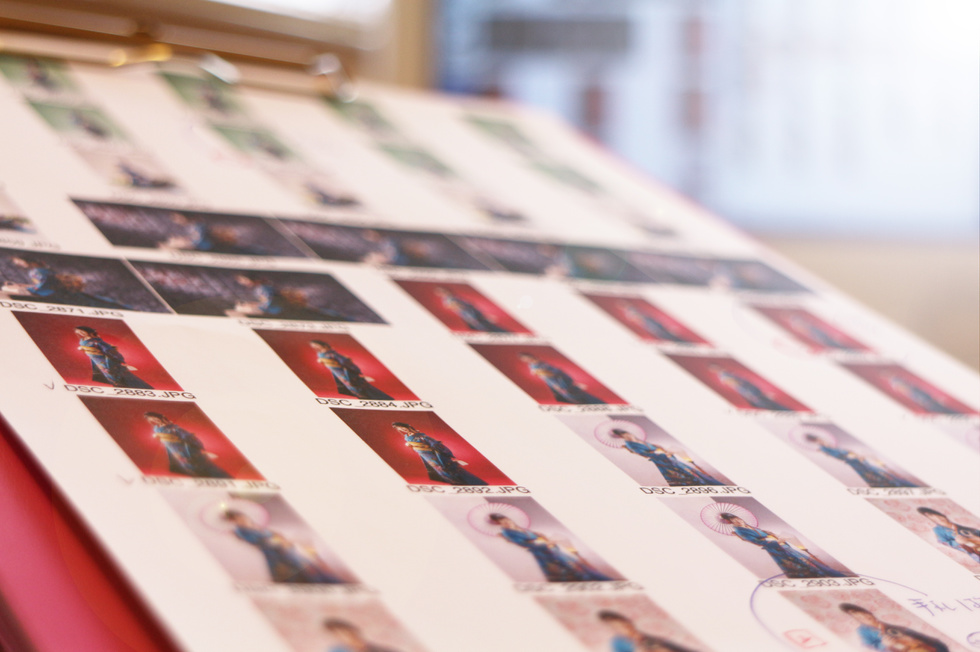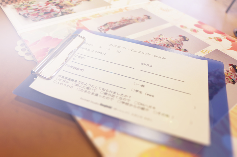 受付にてご予約をお伝えください。また、その際に受付票をお渡ししますのでお待ちいただく間にご記入お願いします。 ご要望の撮影内容をお聞きし撮影メニューをご説明致した後、スタジオにお入り頂き撮影致します。撮影時間は内容にもよりますが30分から120分程度になります。(七五三撮影の着付けのみ要予約にてご利用できます)